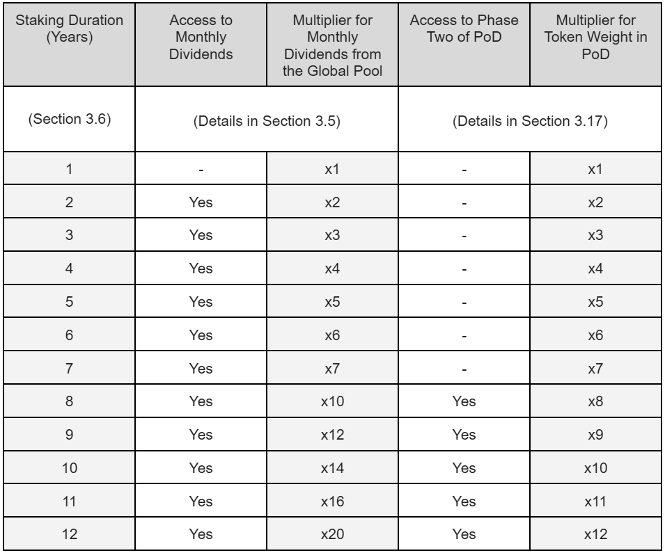 The “Smart-Dividends” mechanism, which includes monthly payouts, is activated for staking durations of 2 years or more. When Wallet A stakes coins for 2 years, its initial multiplier is x2. After one year, this multiplier decreases to x1 and continues to decline annually. The same principle applies to the PoD decision-making mechanism, but with different multipliers.