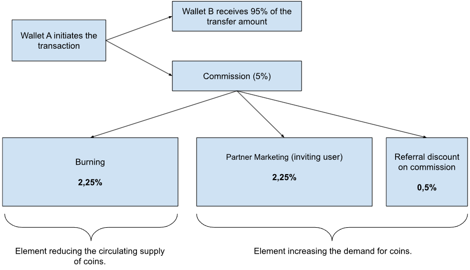 When Wallet A is created using the referral link of Wallet N, 2.25% of the coins from any transaction made by Wallet A are transferred to Wallet N as a reward for participating in the referral program. If Wallet A is not registered via a referral link, the distribution of smart commissions will follow the first scenario described earlier.