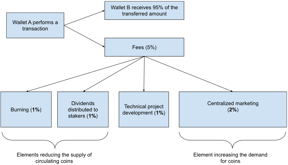 2.25% of the coins are transferred to the "Complete Burn" wallet, where they are permanently removed from circulation. This element systematically reduces the circulating supply of coins, intensifying deflation.