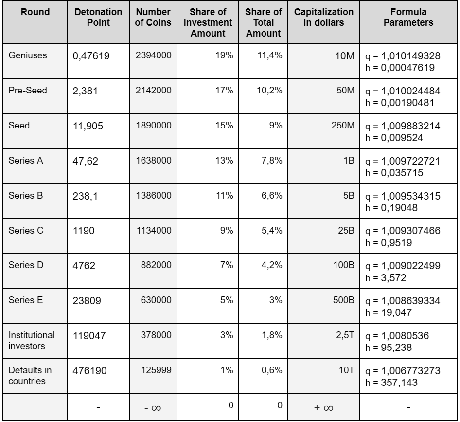 The detonation point is the price level at which an investment stage is completed. Once this point is reached, the transition to the next stage occurs, accompanied by accelerated price growth. This happens because at the beginning of each new stage, the volume of available tokens is minimal, and as the next detonation point approaches, the number of tokens gradually increases (thanks to the "geometric progression of coin placement" principle).