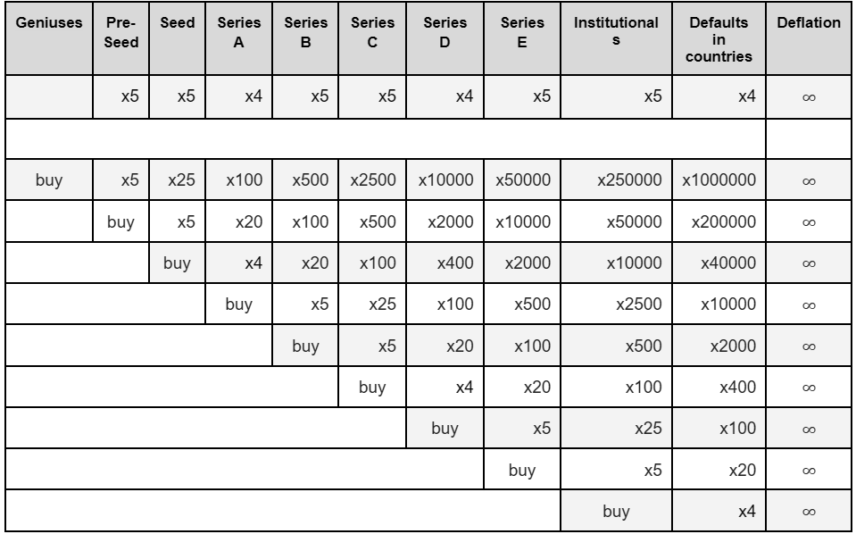 The development of each investment attraction stage involved a detailed analysis of the funding rounds of companies with a market capitalization exceeding $1 trillion (Apple, Microsoft, Amazon, Alphabet, Saudi Aramco, Tesla, NVIDIA), as well as insights from leading cryptocurrencies. Based on this analysis, a structure of 10 investment stages was created to achieve maximum efficiency and sustainable growth for DeflationCoin:
