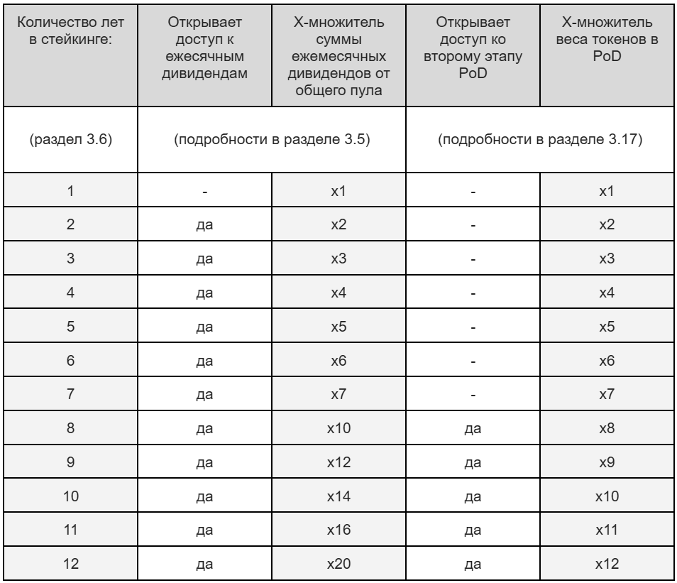 Механизм “Смарт-дивиденды” с ежемесячными выплатами активируется при стейкинге сроком от 2 лет. Когда кошелёк A вносит монеты в стейкинг на 2 года, его начальный множитель равен х2. Через год этот множитель снижается до х1 и продолжает уменьшаться ежегодно. Тот же принцип применяется и к механизму принятия решений PoD, но при других Х-множителях. Важно!