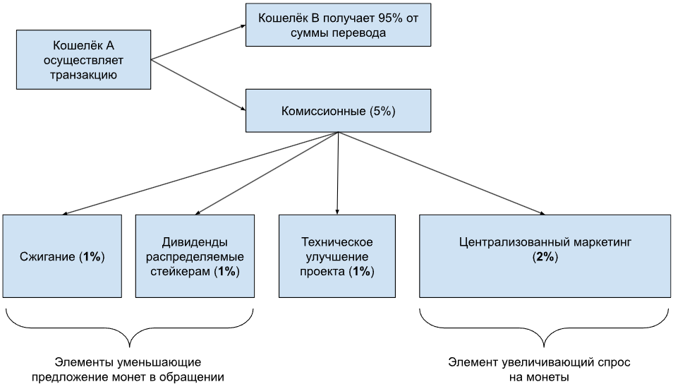 Перед распределением бюджета, выделенного на комиссии (5% от транзакции), из этой суммы сначала взимается необходимая доля для технической поддержки сети. Оставшаяся сумма распределяется поровну между 5 элементами описанными выше.
