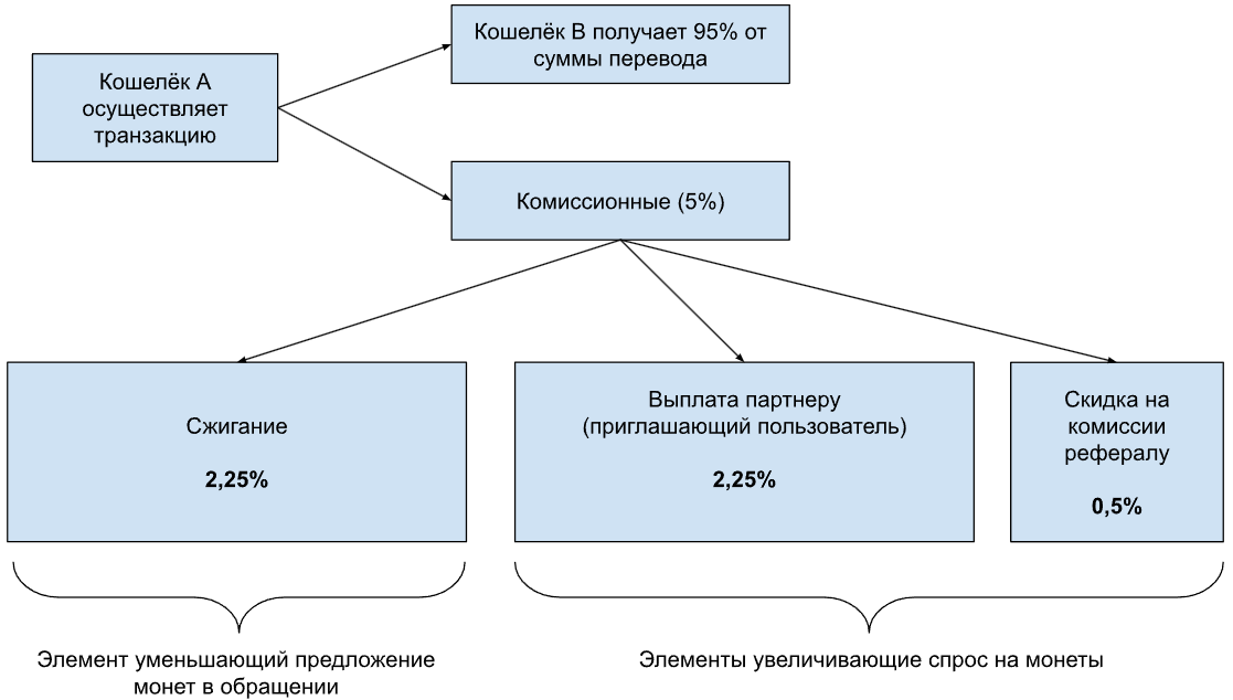 2,25% монет переводится на кошелек “Полное сжигание”, где удаляется из обращения навсегда. Данный элемент будет систематически уменьшать предложение монет в обращение, усиливая дефляцию.