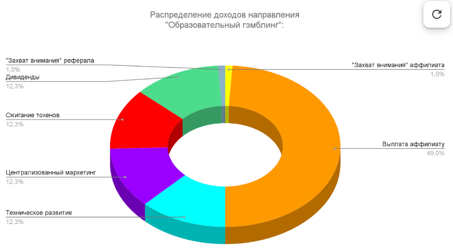 Одним из ключевых инструментов популяризации “Образовательного гэмблинга” является партнёрский маркетинг (раздел 3.9). От 50% дохода казино будет распределяться между аффилиатами в качестве вознаграждения за привлечение новых пользователей. Для удобства пользователей азартные игры будут поддерживать расчёты в валютах стран, резидентами которых они являются. Доходы, генерируемые данным направлением, на ежемесячной основе будут направляться на байбек монет ДефляцияКоин, что усилит спрос и позитивно отразится на росте курса. Половина выкупленных монет будет сжигаться для усиления дефляции, а другая половина — распределяться на выплату смарт-дивидендов держателям монет.