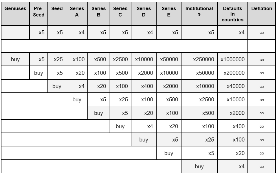 В таблице ниже представлена потенциальная доходность инвесторов в зависимости от этапов покупки и продажи монет. Расчёты основаны на заранее определённых ценовых диапазонах каждой стадии и базовой эмиссии в 20 999 999 монет, без учета монет, которые будут постепенно сжигаться. Таблица позволяет инвестору оценить ожидаемую прибыль в зависимости от стадии приобретения монет.