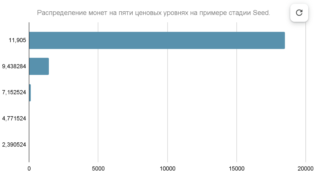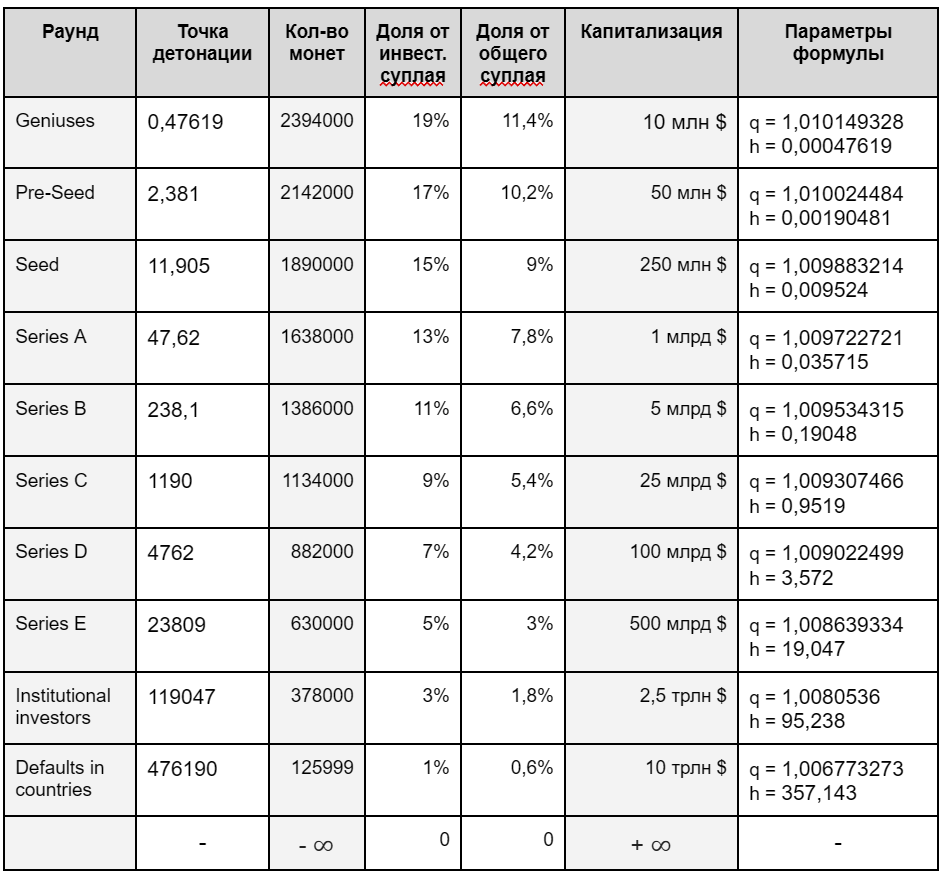 Точка детонации — это ценовой уровень, при достижении которого завершается стадия привлечения инвестиций. После преодоления этой точки происходит переход на следующую стадию, сопровождающийся ускорением роста цены. Это связано с тем, что в начале каждой новой стадии объем доступных монет минимален, а по мере приближения к следующей точке детонации их количество постепенно увеличивается (благодаря принципу “геометрическая прогрессия расположения монет”).